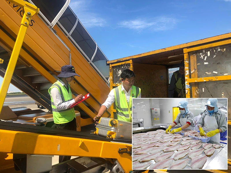 Trong mùa dịch COVID-19, một số hãng hàng không Việt vận chuyển thêm hàng hóa để cải thiện doanh thu (ảnh lớn) và chế biến cá tra Việt xuất khẩu. Ảnh: P.ĐIỀN