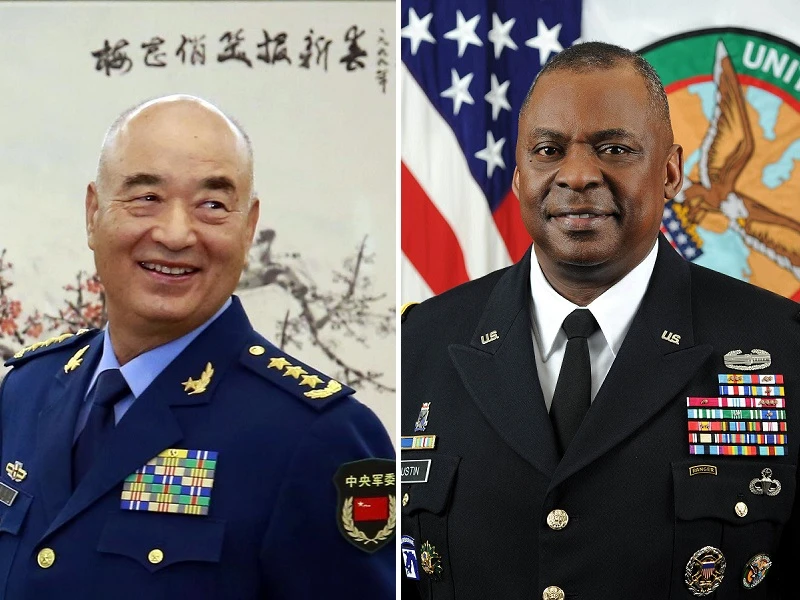Bộ trưởng Quốc phòng Mỹ Lloyd Austin (phải), Phó Chủ tịch Quân ủy trung ương Trung Quốc Hứa Kỳ Lượng (trái). Ảnh: BELT&ROAD NEWS
