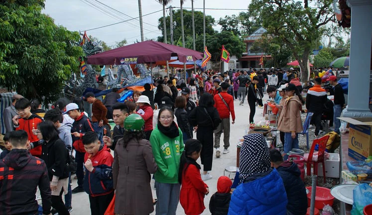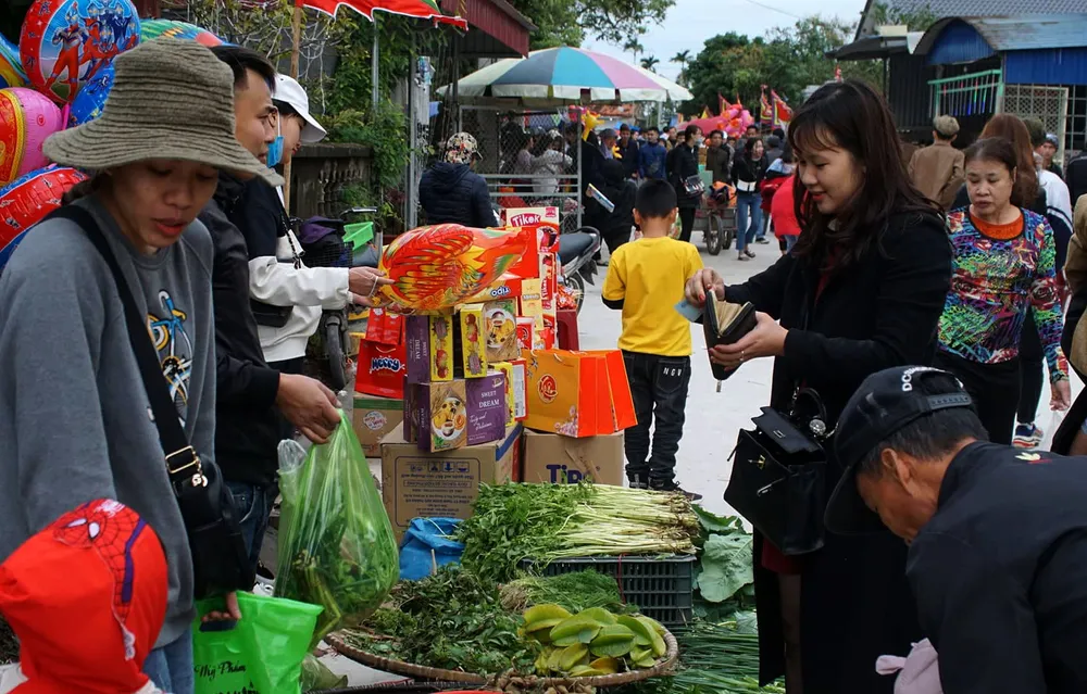 Từ rạng sáng chợ bắt đầu họp, các sạp hàng đủ loại, chủ yếu là sản vật địa phương, từ đồ lễ, túi lộc gạo muối, mớ rau, con cá tới con dao, cái cuốc, đồ chơi trẻ em… đã bày dọc 2 bên đường dẫn vào sân đền. Sau khi lễ đền, người ta dạo quanh các sạp hàng, mua gì đó với mong muốn cả năm sẽ gặp nhiều may mắn.