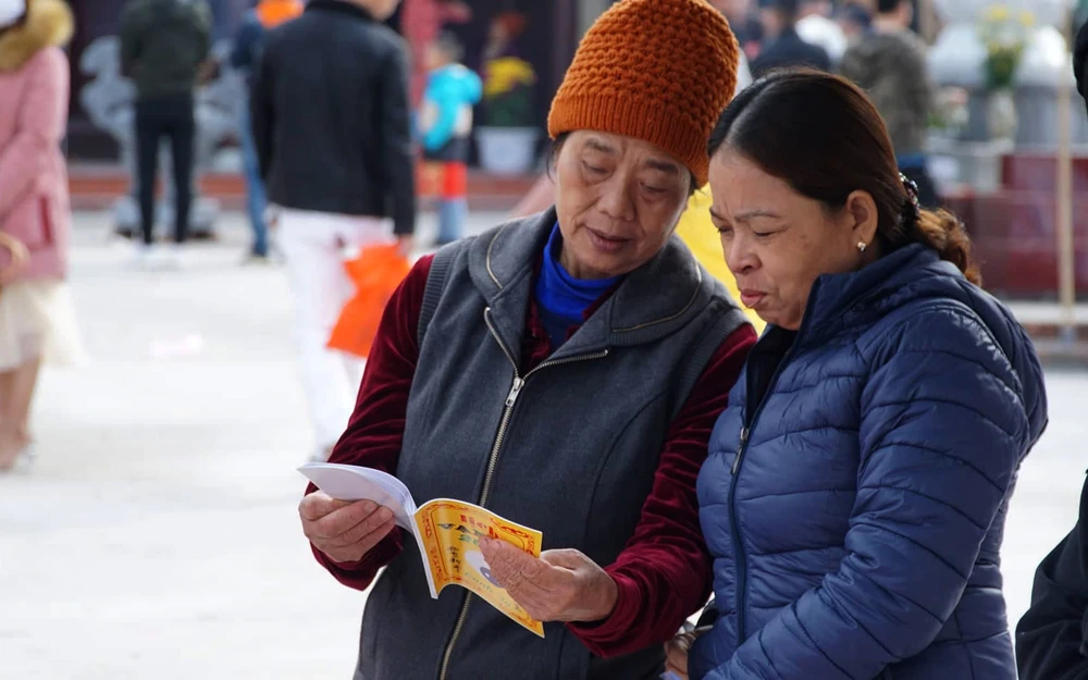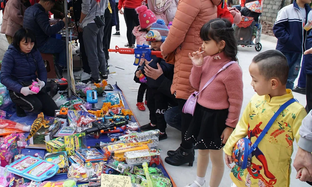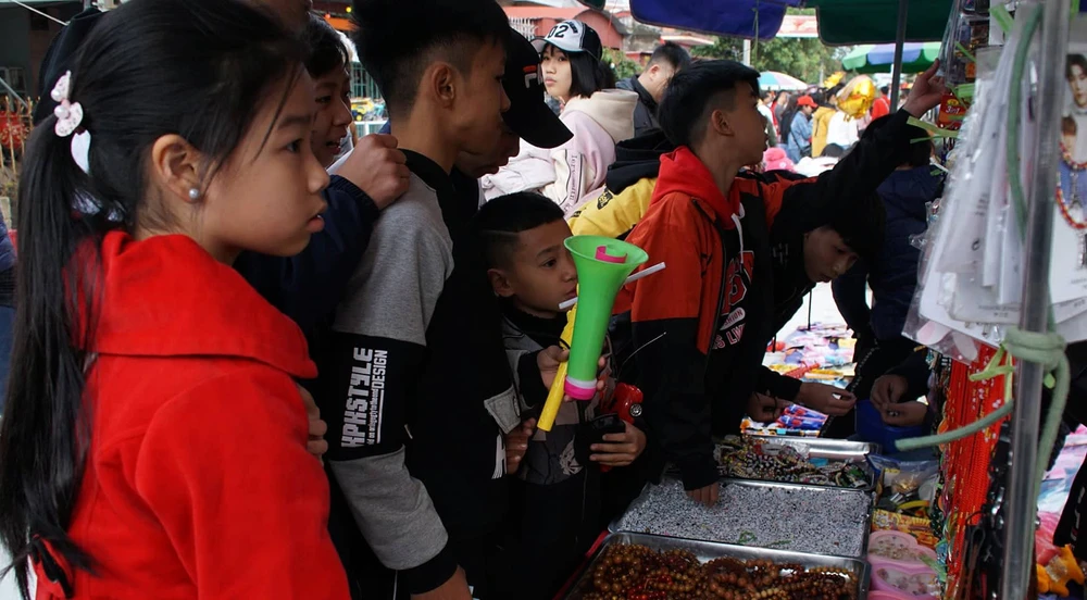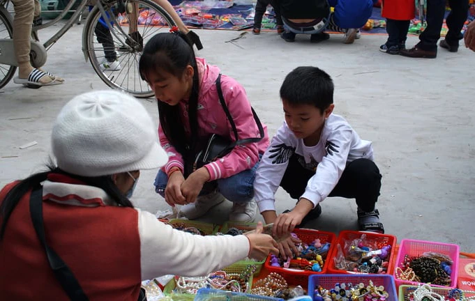 Các cháu nhỏ theo cha mẹ tới mua hàng phiên chợ cầu may