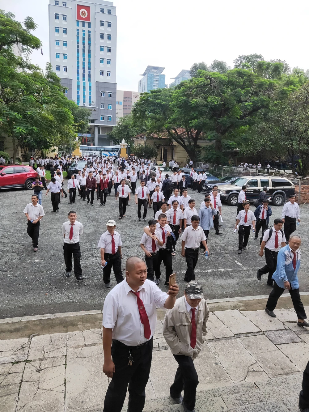 Sân tòa đông nghẹt người do đông đảo tài xế và người lao động phía nguyên đơn đến tham dự phiên tòa, đồng thời có cầm theo các băng rôn, biểu ngữ... Phòng xử án và bãi xe của tòa không còn một chỗ trống.