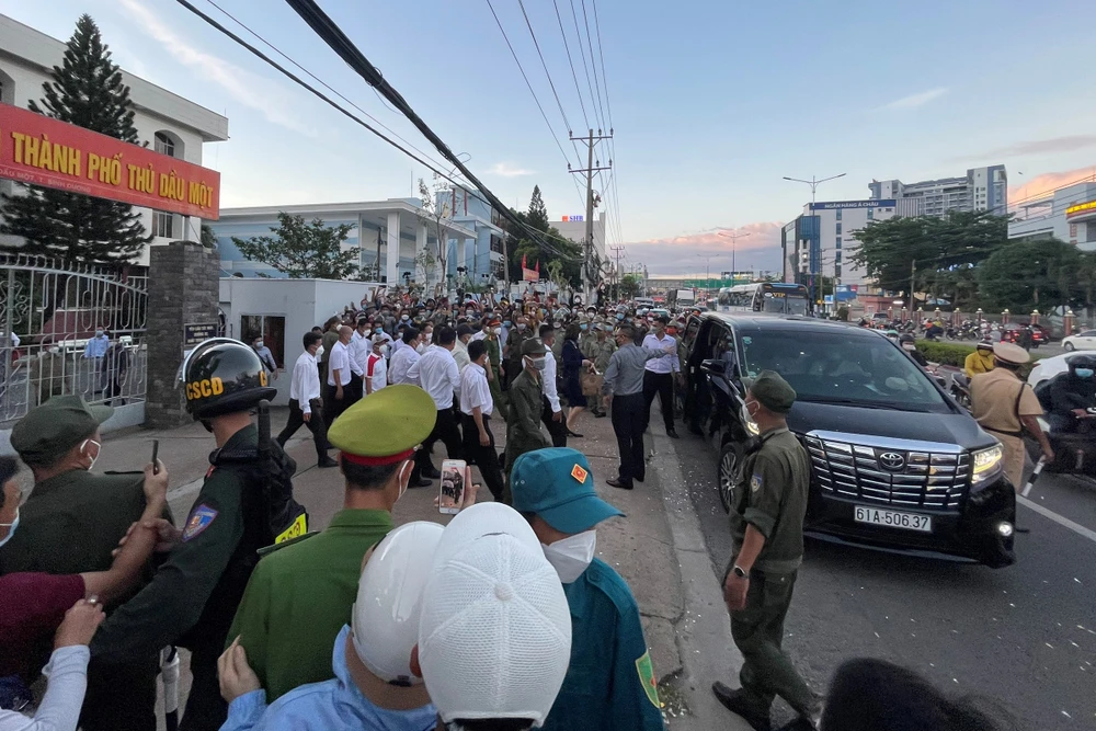 Lực lượng công an tập trung rất đông tại khu vực tòa để bảo vệ an ninh trật tự. Số người qua lại khu vực trước cổng tòa án (quốc lộ 13) rất đông khiến các phương tiện lưu thông qua đây khó khăn.