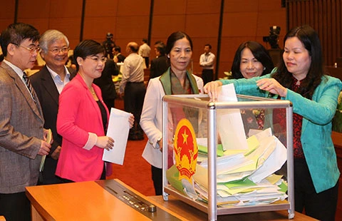 Các đại biểu bỏ phiếu 50 chức danh do Quốc hội bầu hoặc phê chuẩn sáng 15-11. Ảnh: TTXVN