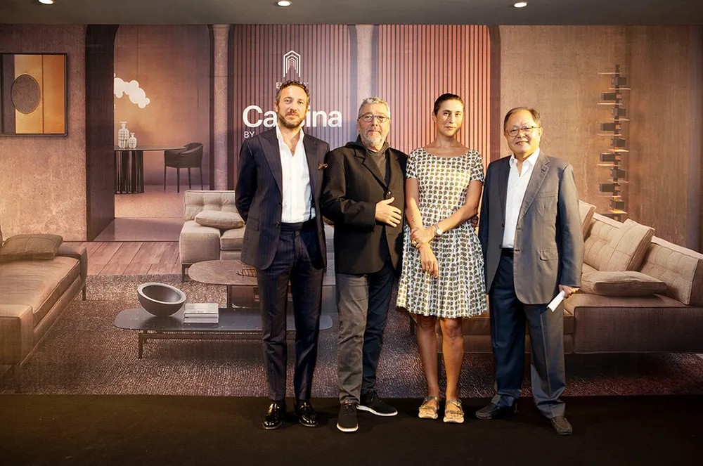 Ông bà Starck (giữa) với ông Vincent Au, đại diện Eurasia Concept và ông Stefano Crea, đại diện Cassina