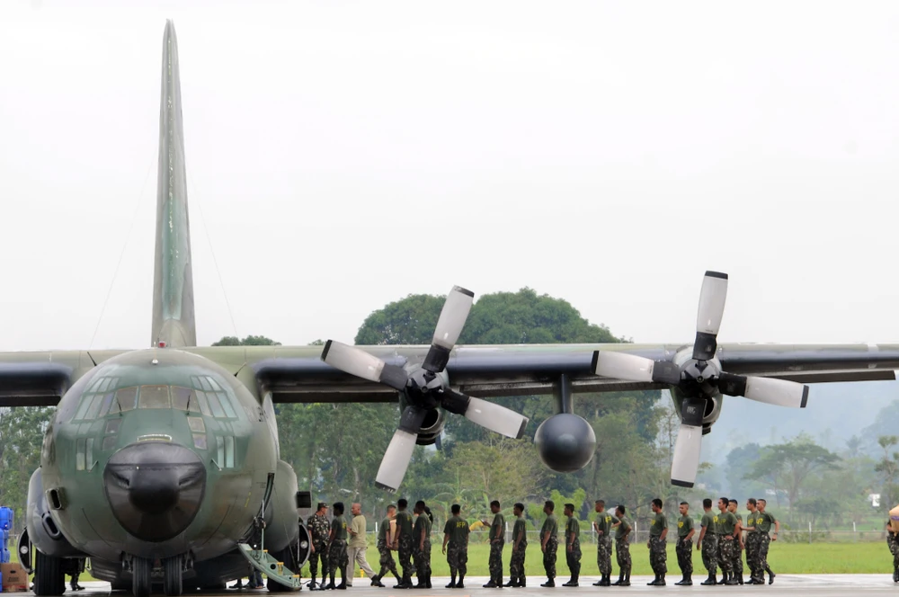 Máy bay vận tải chiến thuật C-130 của không quân Philippines đang dỡ hàng xuống tại sân bay quân sự đảo Panay