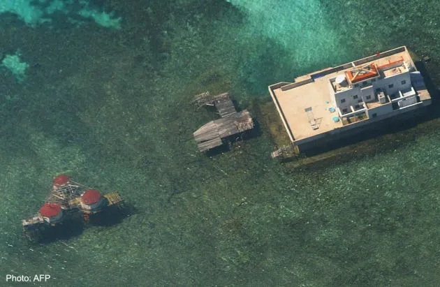 Hình ảnh được chụp từ máy bay Lực lượng Phòng không Philippines hôm 6-11-2013 cho thấy kết cấu công trình của Trung Quốc đã được xây dựng trên Đá Vành Khăn ở biển Đông (Nguồn: Asia One Asia News)