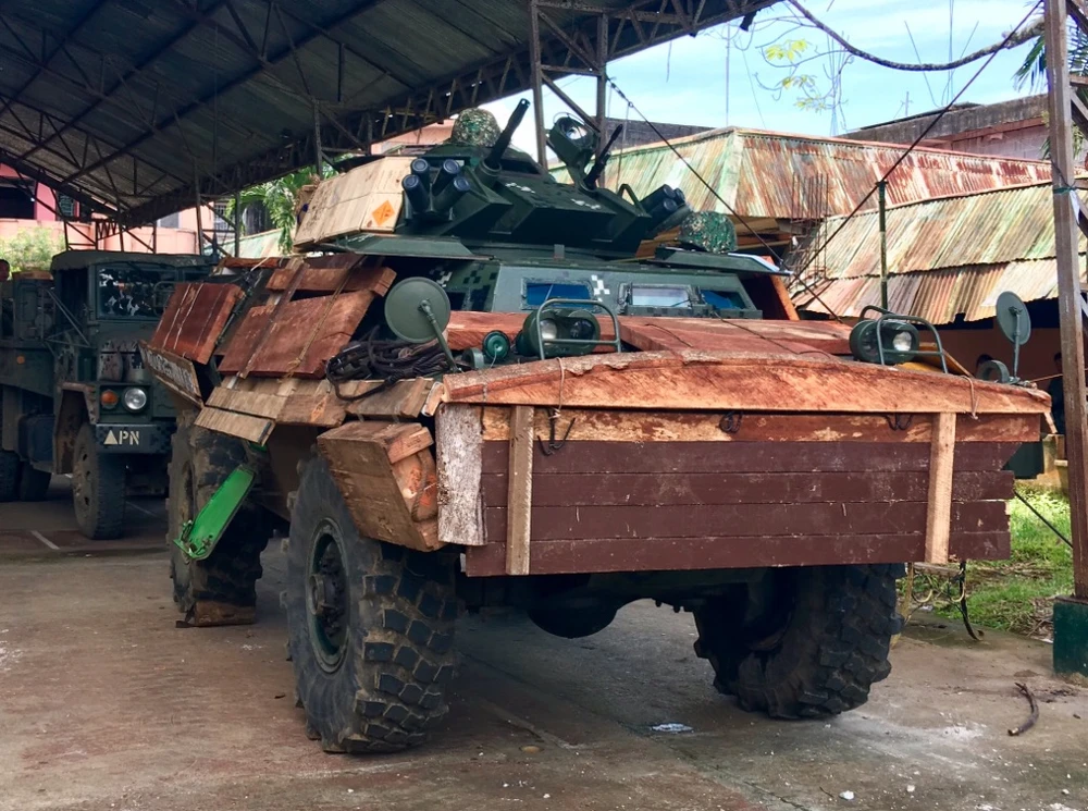 Xe thiết giáp Philippines buộc phải lắp thêm ván gỗ để ngăn đạn chống tăng.
