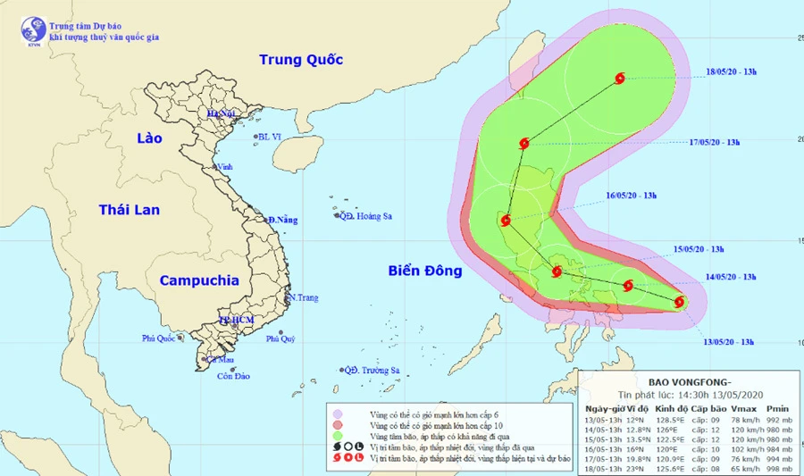 | Theo Trung tâm dự báo KTTV quốc gia, đến 13 giờ ngày 14-5, vị trí tâm bão Vongfong ở khoảng 12,8 độ Vĩ bắc; 126,0 độ Kinh đông, cách bờ biển miền Trung Philippines 100 km về phía Đông. Sức gió mạnh nhất vùng gần tâm bão mạnh cấp 11-12 (100-135 km/giờ), giật cấp 14. Trong 48-72 giờ tiếp theo, bão di chuyển theo hướng tây bắc, mỗi giờ đi được khoảng 15 km. Đến 13 giờ ngày 16-5, vị trí tâm bão ở khoảng 16,0 độ Vĩ bắc; 120,0 độ Kinh đông, trên khu vực phía tây đảo Ludong (Philippines). Sức gió mạnh nhất vùng gần tâm bão mạnh cấp 9-10 (75-100 km/giờ), giật cấp 12. Tại Việt Nam, các địa phương ven biển cần theo dõi chặt chẽ diễn biến của bão, đề phòng bão đổi hướng đi vào Biển Đông; thông báo cho tàu thuyền hoạt động trên biển biết vị trí và hướng di chuyển của bão để chủ động phòng tránh. |