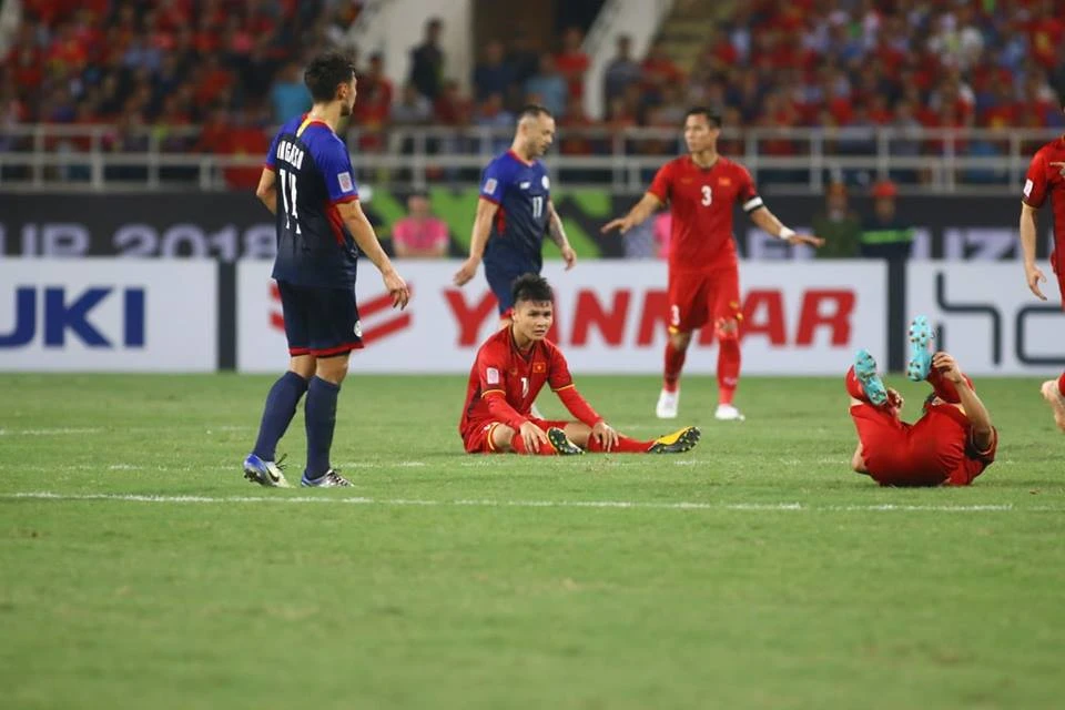 Phút 49, từ quả treo bóng vào của Philippines, Văn Hậu phải nằm sân sau pha va chạm cầu thủ Philippines và với cả thủ thành Văn Lâm.