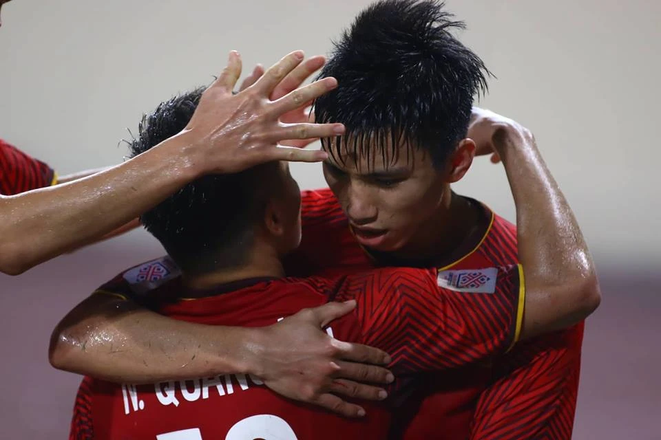 Phút 17, Văn Hậu bật cao đánh đầu kiến tạo cho Quang Hải băng lên dứt điểm rất căng nhưng bóng đi vọt xà.