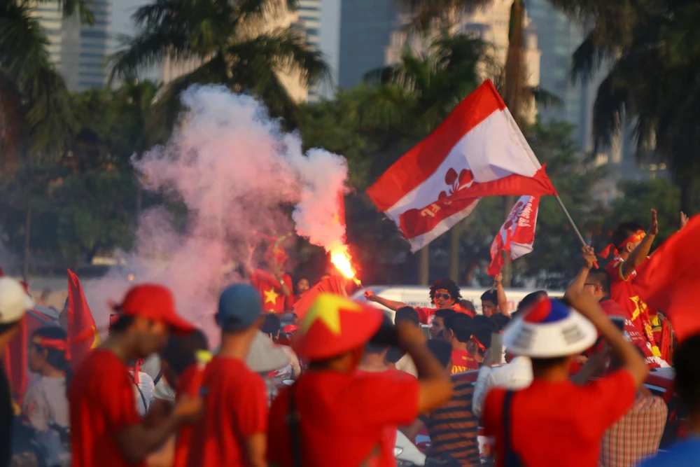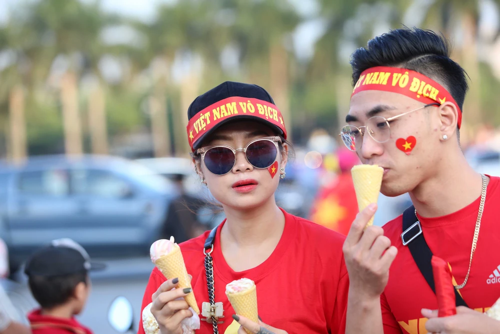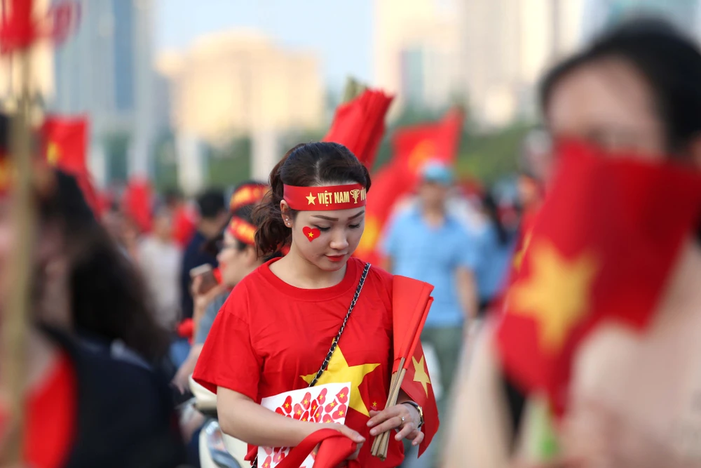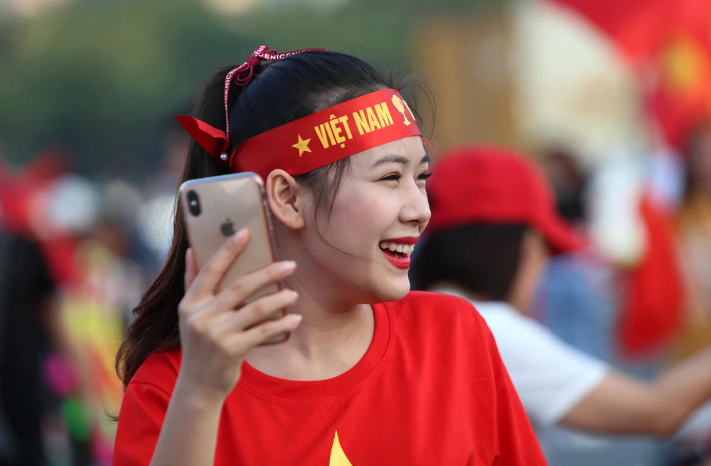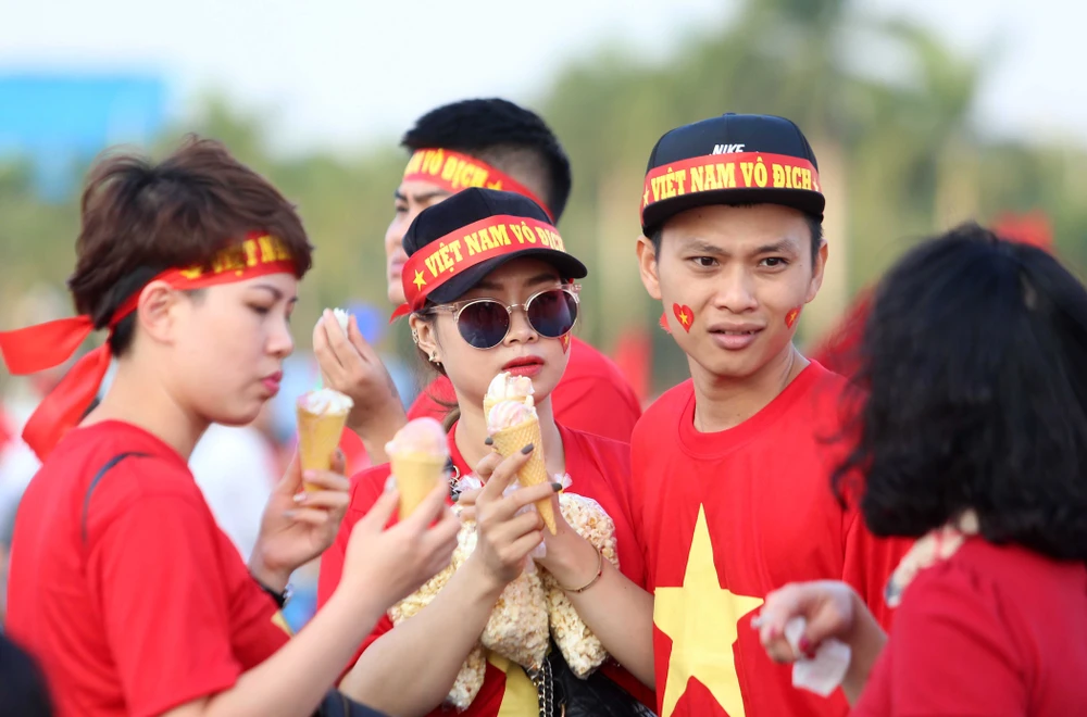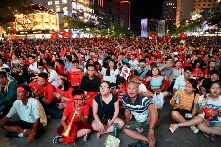 CĐV Việt Nam tại phố đi bộ Nguyễn Huệ. Ảnh: HOÀNG GIANG