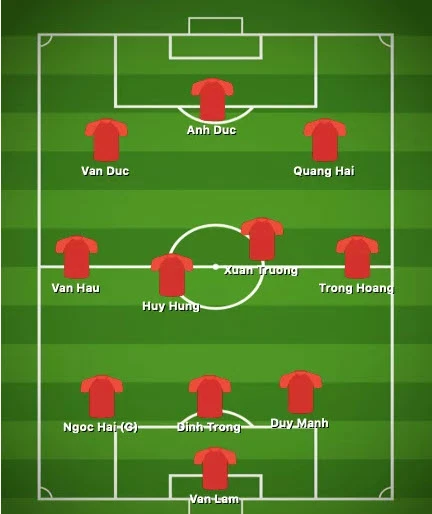 Ở trận đấu này, Xuân Trường sẽ thay Hùng Dũng đá cặp với nhau ở trung tâm hàng tiền vệ. Đây là sự thay đổi duy nhất của HLV Park Hang-seo so với trận thắng Philippines 2-1 ở lượt đi.