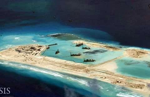 Ảnh vệ tinh vào tháng 3-2015 cho thấy hoạt động xây đảo nhân tạo trái phép của Trung Quốc tại đá Vành khăn. Ảnh: TRUNG TÂM NGHIÊN CỨU QUỐC TẾ VÀ CHIẾN LƯỢC