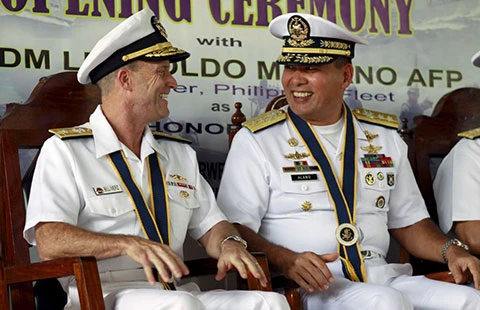 Chuẩn đô đốc Mỹ William Merz (trái) và chuẩn đô đốc Philippines Leopoldo Alano tại lễ khai mạc tập trận ở Puerto Princesa ngày 22-6. Ảnh: REUTERS