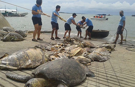 Rùa biển có nguy cơ tuyệt chủng bị ngư dân Trung Quốc khai thác trái phép trên biển Đông bị cảnh sát biển Philippines thu giữ ngày 6-5. Ảnh: AFP