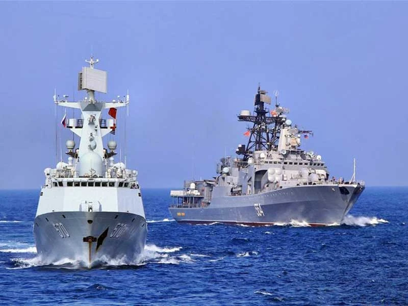 Tàu hộ vệ tên lửa Hoàng Sơn của Trung Quốc và tàu chống tàu ngầm Đô đốc Tributs của Nga tham gia tập trận trên vùng biển Quảng Đông ngày 16-9. Ảnh: THX