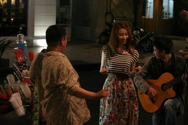 | Quách Ngọc Ngoan và Ngân Khánh trong một cảnh quay. |