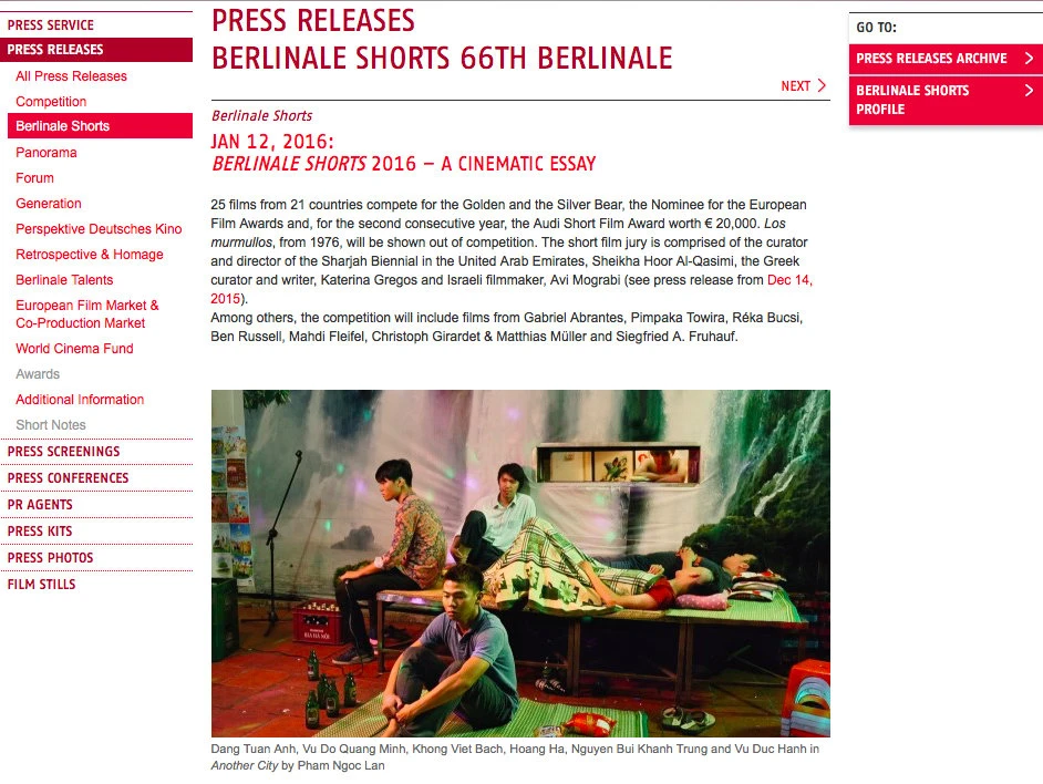 Trên thông cáo báo chí của trang mạng LHP Berlin, cảnh trong phim Another City cũng là hình ảnh duy nhất được chọn làm hình cho thông tin về hạng mục phim ngắn - Ảnh chụp màn hình trang mạng LHP Berlin