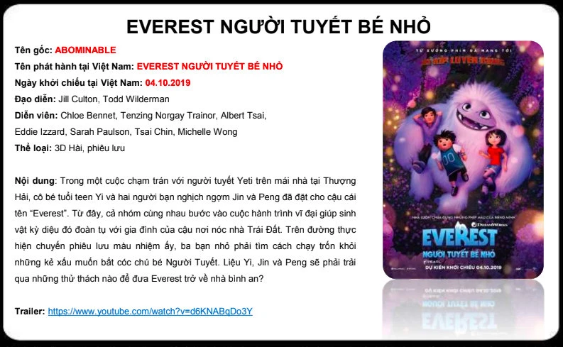 Abominable là bộ phim hoạt hình mới nhất được phát hành bởi CGV Việt Nam. Phim cũng từng đứng đầu doanh thu phòng vé Mỹ vào cuối tuần trong đợt công chiếu cuối tháng 9 và rất thu hút khán giả nhỏ tuổi lẫn các gia đình khi chiếu tại Việt Nam.