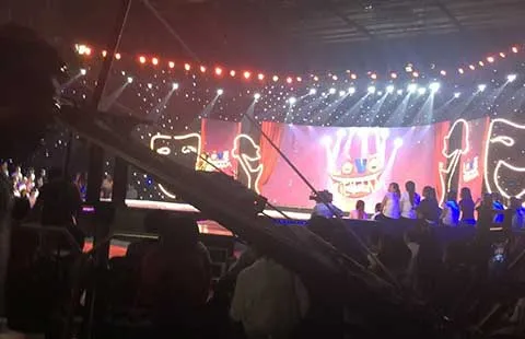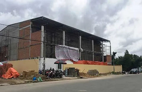 Khi chúng tôi đến, công trình không thi công nhưng bên trong có hơn 100 người đang tham gia quay chương trình Lò võ tiếu lâm. “Công trình đang xây dựng thì tạm ngưng để đoàn làm phim quay xong rồi xây tiếp” - một người thợ đang giữ vật tư công trình cho biết.