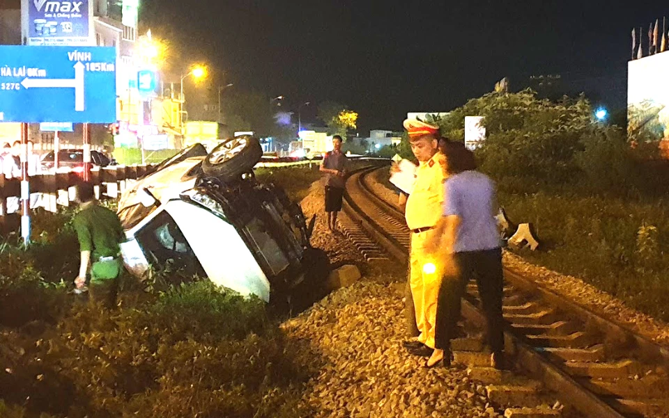 Chiều tối 29-10, trên địa bàn thị trấn Hà Trung (huyện Hà Trung, Thanh Hóa) xe Huyndai Tucson 36A-449.25 băng qua đường ray bị tàu hỏa tông văng nhiều mét.
