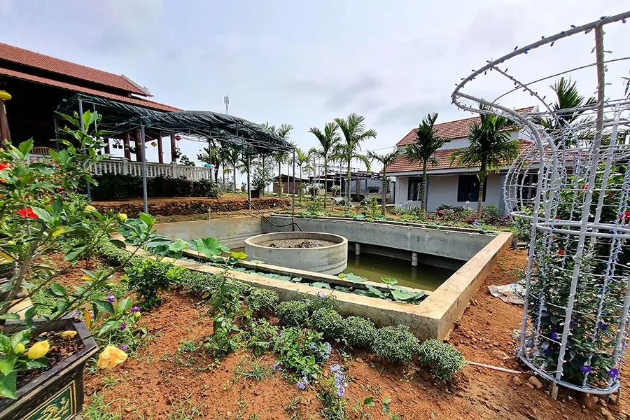 Ghi nhận của Pháp Luật TP.HCM ngày 27-3, nhiều hạng mục sắp hoàn thành như đèn chiếu sáng, trang trí, hồ nước lớn… còn gần cuối khu vực là trang trại nuôi heo, dê. Khu đất có bốn nhà rường được xây dựng chắc chắn với khu vệ sinh riêng đã hoàn thiện. Nằm giữa khu đất là một ngôi nhà cấp 4. Xung quanh các công trình này được trồng các loại cây ăn trái như thanh long, ổi, vú sữa, cóc…