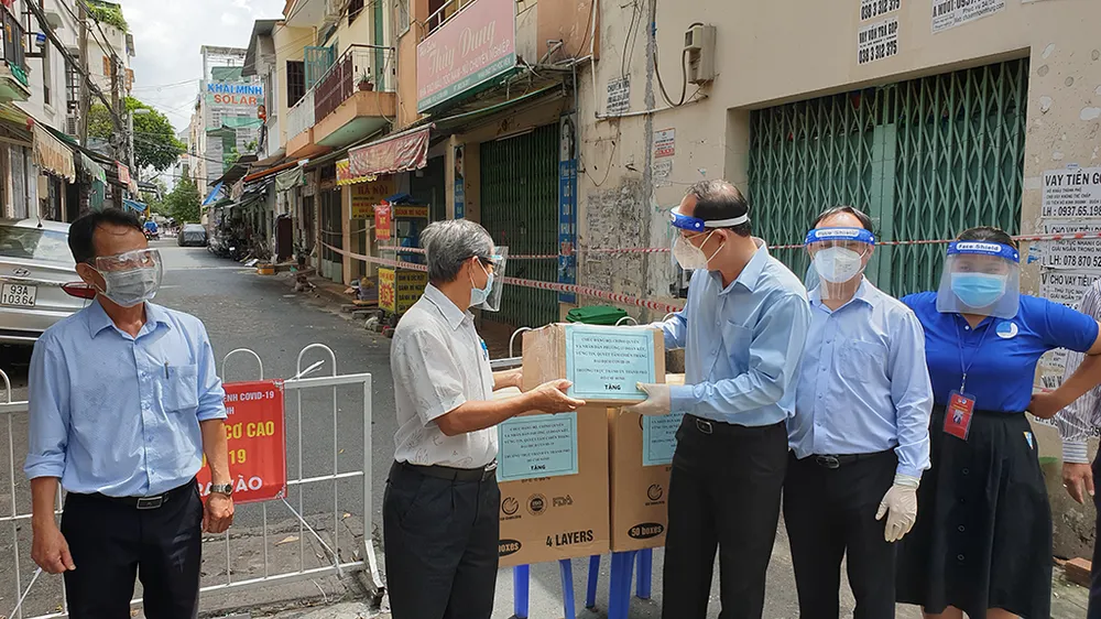 Phó Bí thư Thành ủy TP.HCM, Nguyễn Hồ Hải đã đến thăm, tặng quà tại khu phố 1 (phường 15, quận Tân Bình) là điểm giữ vững "vùng xanh". Ảnh: NT