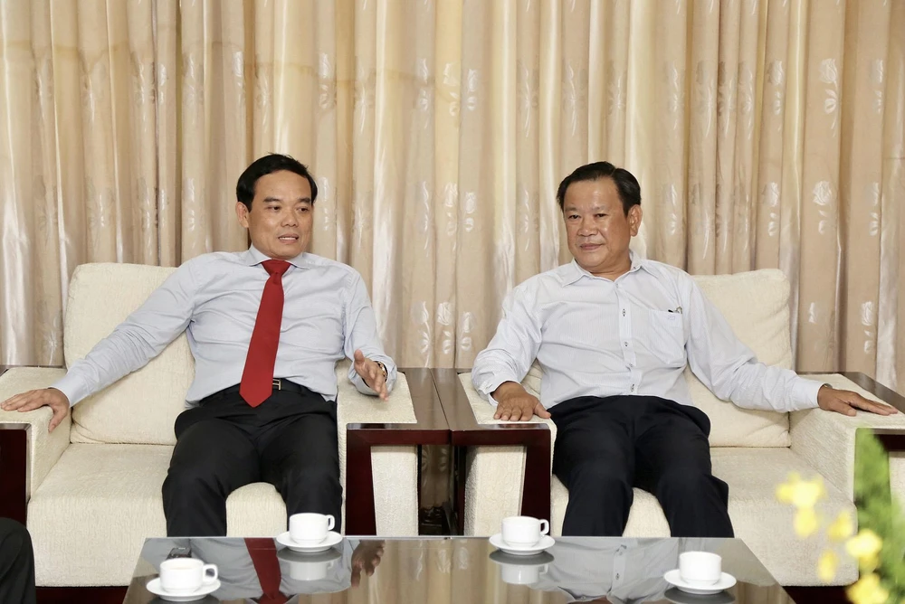 Phó Bí thư Thường trực Thành ủy Trần Lưu Quang đang trao đổi với Tổng biên tập Mai Ngọc Phước. Ảnh: HOÀNG GIANG