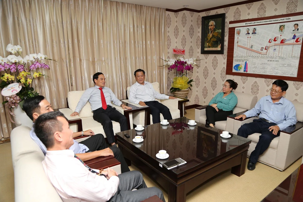 Phó Bí thư trường trực Thành ủy Trần Lưu Quang dẫn đầu đoàn công tác đến thăm và chúc mừng báo Pháp Luật TP.HCM. Ảnh: HOÀNG GIANG.