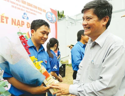 Phó Bí thư Thường trực Thành ủy TPHCM Nguyễn Văn Đua tặng hoa chúc mừng các sinh viên được kết nạp Đảng tại Trà Vinh. (Ảnh: SGGP)