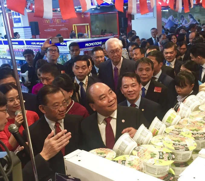 Thủ tướng Nguyễn Xuân Phúc tham quan gian hàng Việt tại đại siêu thị FairPrice Xtra, Phó Tổng Giám đốc Saigon Co.op Nguyễn Anh Đức (bên phải), ông Seah Kian Peng, Tổng Giám đốc Tập đoàn NTUC FairPrice (bên trái).