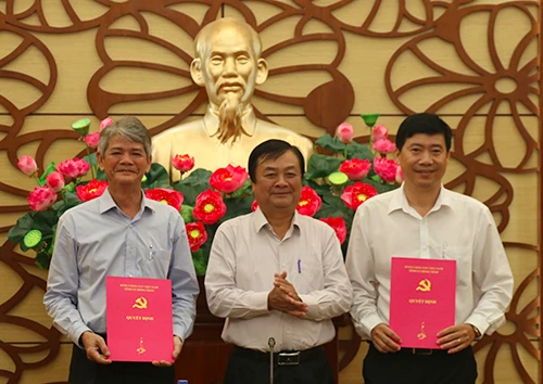 Bí thư Tỉnh ủy Đồng Tháp Lê Minh Hoan và 2 cán bộ chủ chốt sau khi nhận quyết định điều động. Ảnh: dongthap.gov.vn