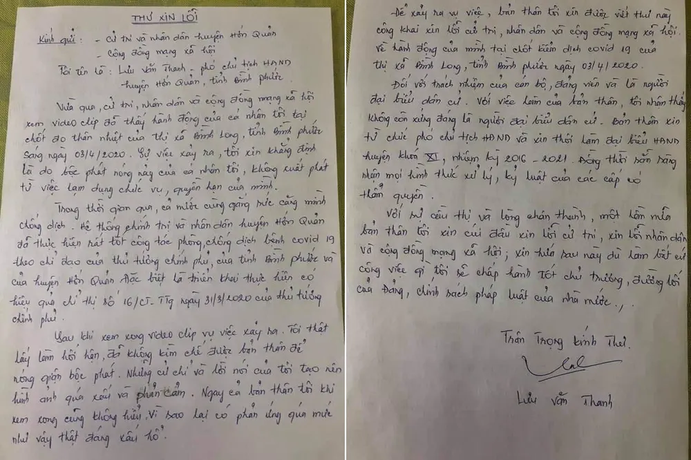 Ngày 14-4, ông Lưu Văn Thanh - Phó Chủ tịch HĐND huyện Hớn Quản (Bình Phước), đã viết tâm thư công khai xin lỗi nhân dân và xin được từ chức.