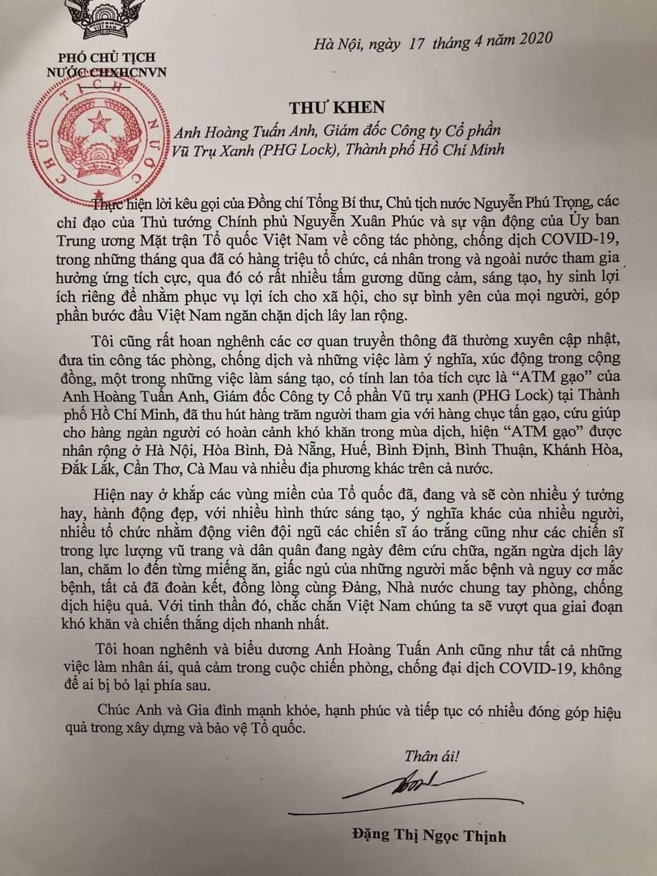 Thư khen anh Hoàng Tuấn Anh, người sáng lập ra chiếc máy ATM gạo của Phó Chủ tịch nước Đặng Thị Ngọc Thịnh. Ảnh: NGUYỄN HIỀN