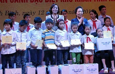 Phó Chủ tịch nước Nguyễn Thị Doan tặng quà cho các em học sinh ở Ninh Bình. Ảnh: TTXVN