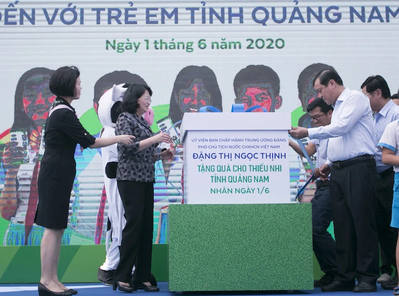 Phó Chủ tịch nước Đặng Thị Ngọc Thịnh tặng quà cho thiếu nhi tỉnh Quảng Nam. Ảnh: TN