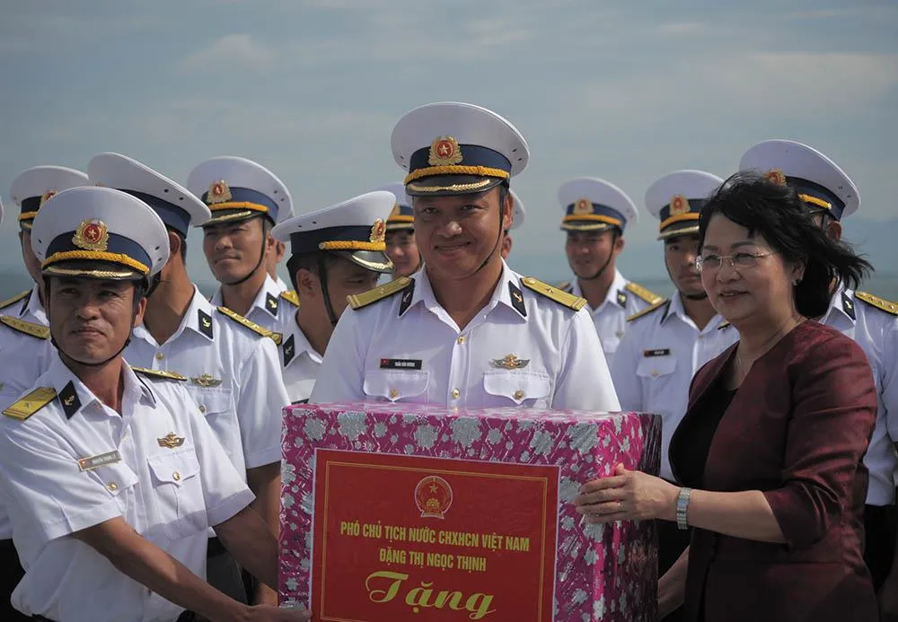 Phó Chủ tịch nước Đặng Thị Ngọc Thịnh chuyển lời thăm hỏi, động viên của Tổng Bí thư, Chủ tịch nước Nguyễn Phú Trọng đến toàn thể cán bộ, chiến sĩ Vùng 4 Hải quân, quân và dân huyện đảo Trường Sa.