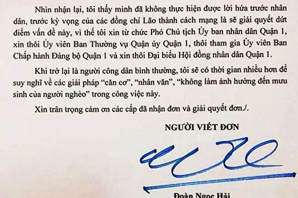Nêu lý do từ chức, ông Hải viết: “Nhìn nhận lại, tôi thấy mình đã không thực hiện được lời hứa trước nhân dân, trước kỳ vọng của các đồng chí lão thành cách mạng là sẽ giải quyết dứt điểm vấn đề này. Vì thế tôi xin từ chức phó chủ tịch UBND quận 1, thôi giam gia ủy viên BCH Đảng bộ quận 1 và xin thôi đại biểu HĐND quận 1”.