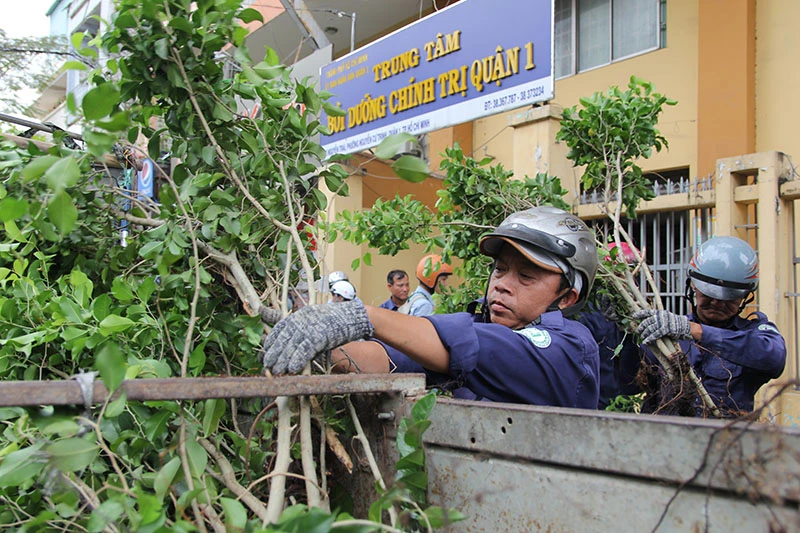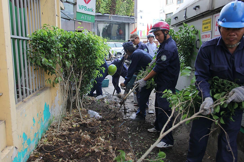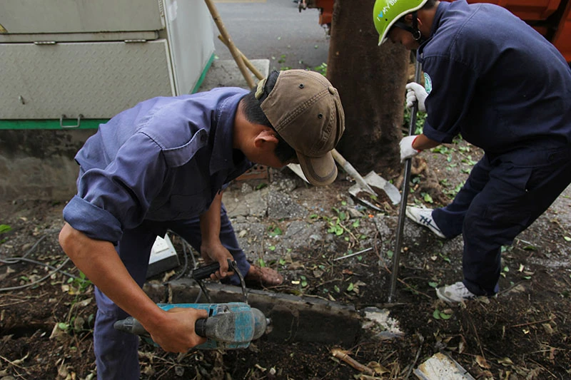 Nhân viên Công ty Môi trường đô thị đang dọn bồn cây để phá dỡ phần xây lấn chiếm vỉa hè.