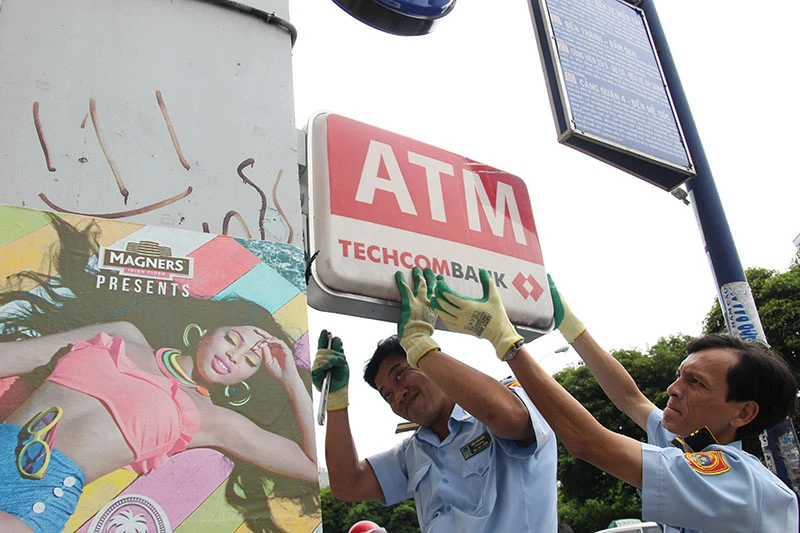 Bảng ATM nằm trên bức tường ngay lề đường cũng bị gỡ bỏ. Riêng bức tường chắn lối người đi bộ, ông Hải yêu cầu lập biên bản và phá dỡ. Chi phí phá dỡ phía người vi phạm phải chịu hoàn toàn.