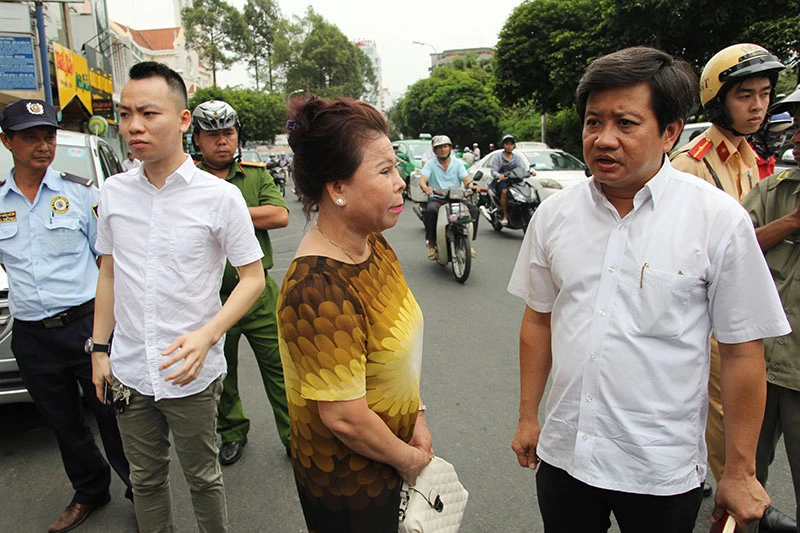 Phó Chủ tịch UBND quận 1 Đoàn Ngọc Hải dừng lại tại tòa nhà 208 Nguyễn Trãi yêu cầu các lực lượng xử lý ô tô đậu lấn chiếm vỉa hè.