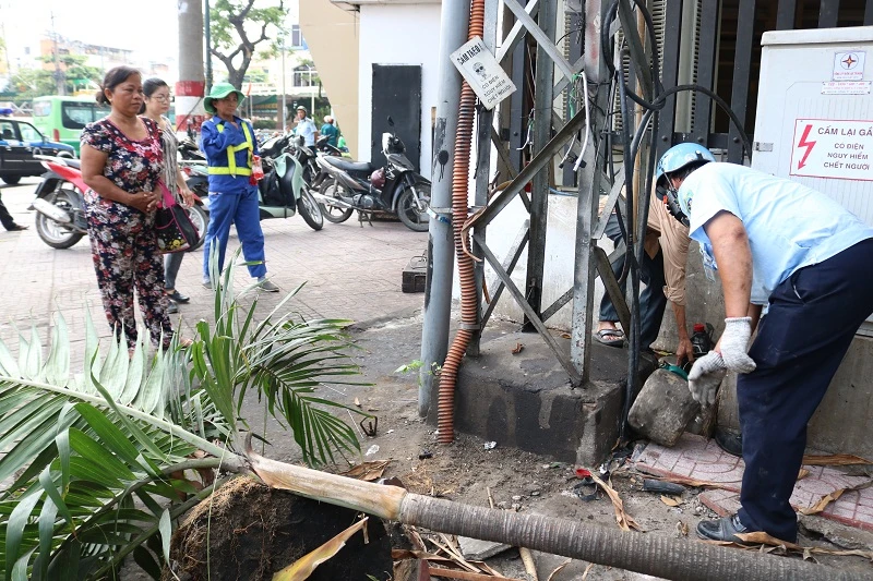Dọn dẹp cây xanh trên góc giao với đường Nguyễn Văn Cừ. Ảnh: THANH TUYỀN