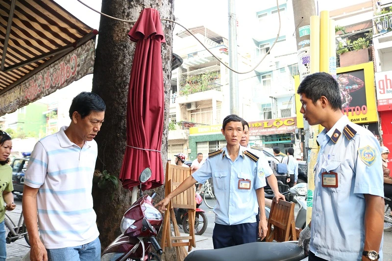Nhắc nhở chủ quán cà phê về biển hiệu và dựng xe trên vỉa hè. Ảnh: THANH TUYỀN