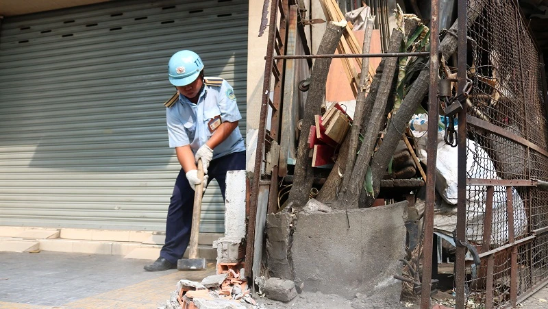 Tiến hành tháo dỡ khung sắt của một cửa tiệm trên đường. Ảnh: THANH TUYỀN