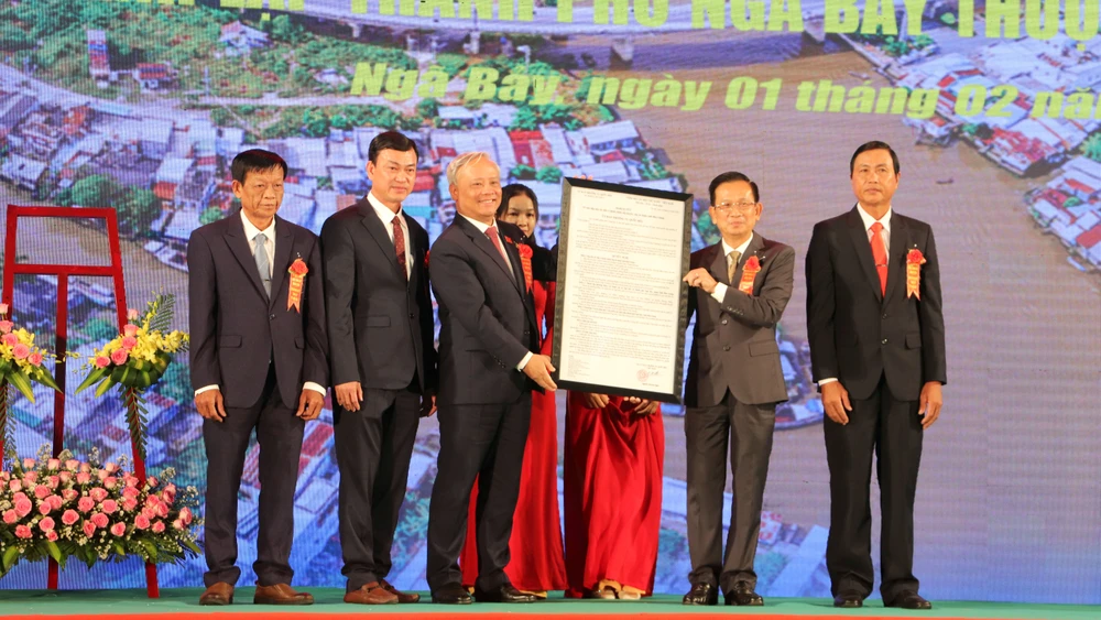 Ông Uông Chu Lưu, Phó Chủ tịch Quốc hội, trao nghị quyết của Ủy ban Thường vụ Quốc hội về thành lập TP Ngã Bảy thuộc tỉnh Hậu Giang. Ảnh: CHÂU ANH