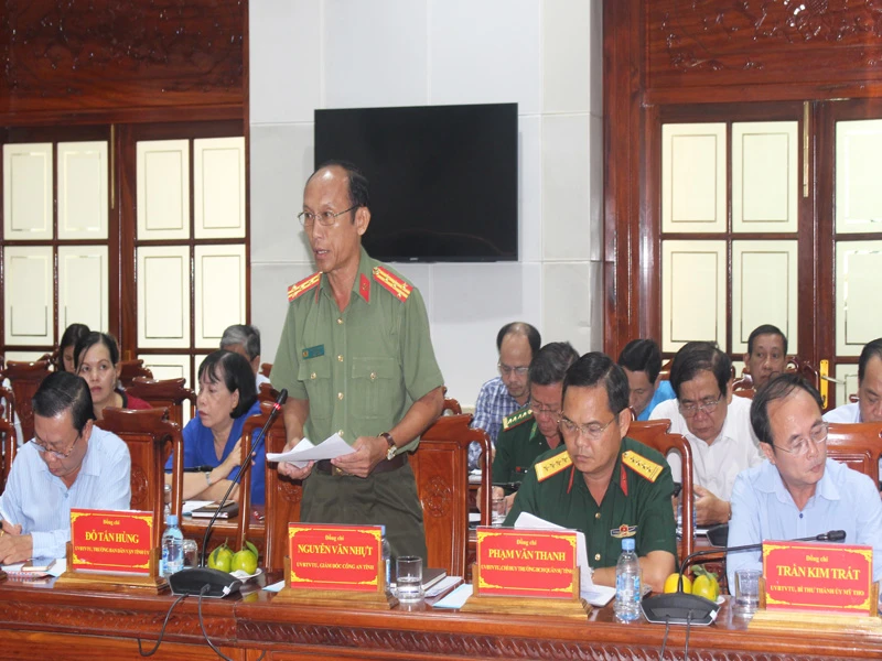 Đại tá Nguyễn Văn Nhựt - Giám đốc Công an tỉnh Tiền Giang phát biểu công tác chuẩn bị đảm bảo an ninh trật tự trong cuộc bầu cử sắp tới. Ảnh: ĐH