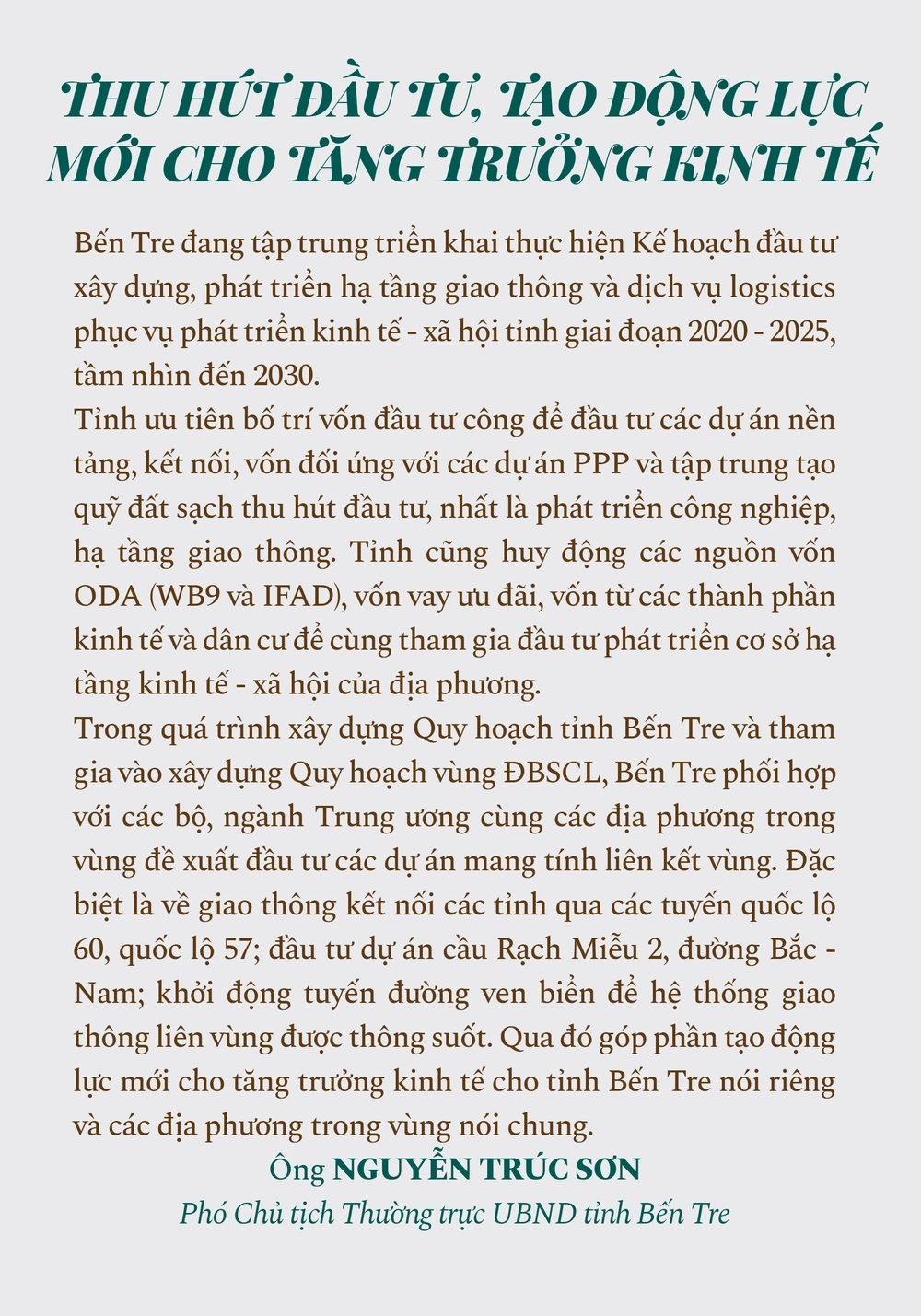 + Bến Tre rất quan tâm và luôn chủ động, trách nhiệm trong triển khai thực hiện các hoạt động liên kết vùng nhằm khai thác hiệu quả tiềm năng, lợi thế sẵn có của các địa phương, góp phần từng bước đưa vùng ĐBSCL trở thành khu vực phát triển nhanh và năng động.