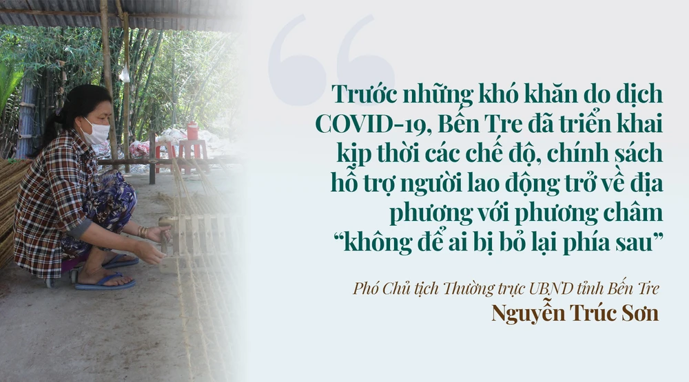 + Lãnh đạo tỉnh chia sẻ khó khăn chung mà NLĐ đã và đang đối diện trong đợt đại dịch và làm hết sức để giảm nhẹ khó khăn cho người dân. Bến Tre đã triển khai nhanh chóng, kịp thời các chế độ, chính sách hỗ trợ NLĐ trở về địa phương bằng nguồn ngân sách và vận động các nguồn lực xã hội với phương châm “không để ai bị bỏ lại phía sau”.
