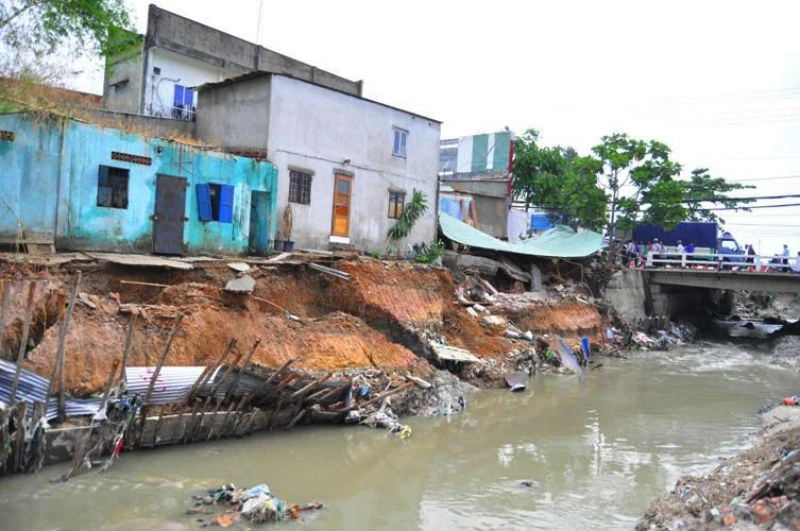 Bờ kè cầu Xóm Mai bị sụp đổ sau cơn mưa lớn khi công trình mới hoàn thành.