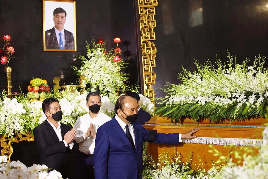 Chủ tịch nước Nguyễn Xuân Phúc thắp hương tiễn biệt Phó Chủ tịch UBND TP.HCM Lê Hòa Bình. Ảnh: NGUYỆT NHI